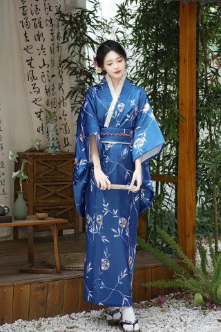 ++พร้อมส่ง++ชุดกิโมโนยาว กิโมโนญี่ปุ่นยาว สีน้ำเงิน พิมพ์ลายดอกไม้น่ารัก